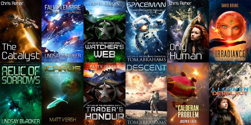 Let's start with Lindsay Buroker. A peerless crafter of both worlds and characters, her Fallen Empire series is some of her finest work. We've got the collected edition of her first three Fallen Empire novels, and the fourth as a bonus! Chris Reher's Targon Tales are brilliant space opera stories. Each book is a satisfying story of conflict and struggle in space, and we've got two for you to enjoy. David Bruns's Irradiance is a complex and thought-provoking look at a seemingly utopian world that hides a sinister truth. For those more interested in unlikely and unwilling adventurers, Derelict by LJ Cohen reveals what happens when the remnants of an ancient war suddenly make their way back into the stars. A heap of intrigue, blackmail, and terrorism await you in Icarus by Matt Verish. Patty Jansen, another luminary among the indie author ecosystem, has given us not one but two books in the Return of the Aghyrians series. Loaded with complex and fascinating world building, these stories will draw you in and keep you riveted. As if that wasn't enough, we've even got the first two SpaceMan Chronicles by Tom Abrahams, stories of desperation and survival woven with NASA-like precision. And as a little bit of a palate cleanser between hearty courses of space opera, how about The Calderan Problem, the most recent entry in my swashbuckling steampunk series Free-Wrench?