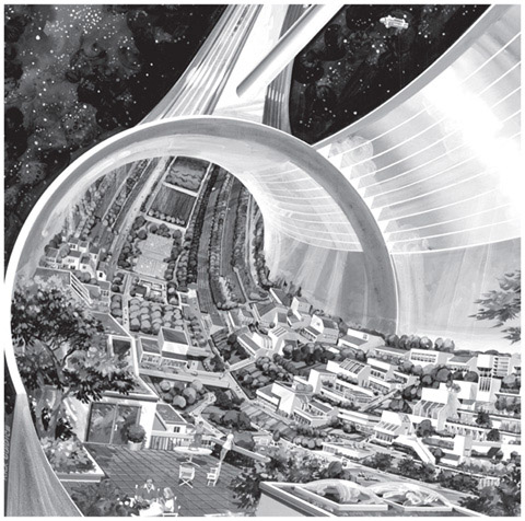 The screen is filled by an artist’s rendering in luscious pinks, yellows and oranges. It is part of a ring. Its starry, galactic setting clearly suggests that it exists somewhere in outer space. Hugging the outer perimeter of the transparent ring is a low-rise suburban cityscape. Houses, trees, pathways…people!